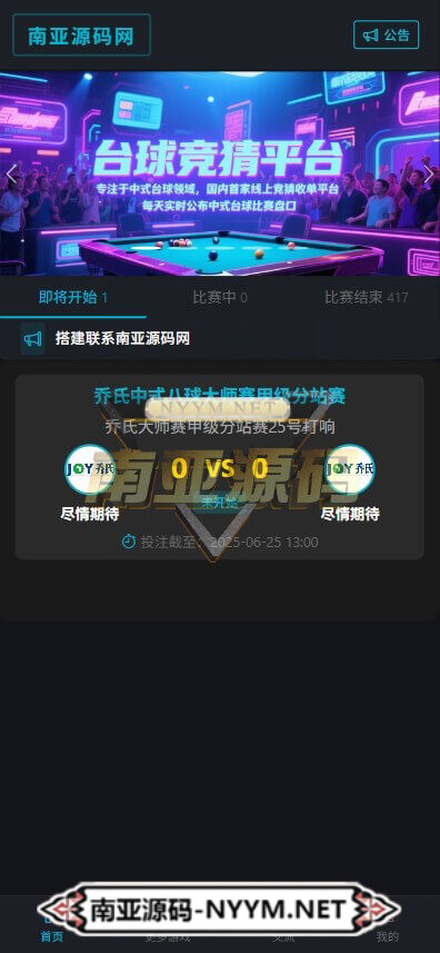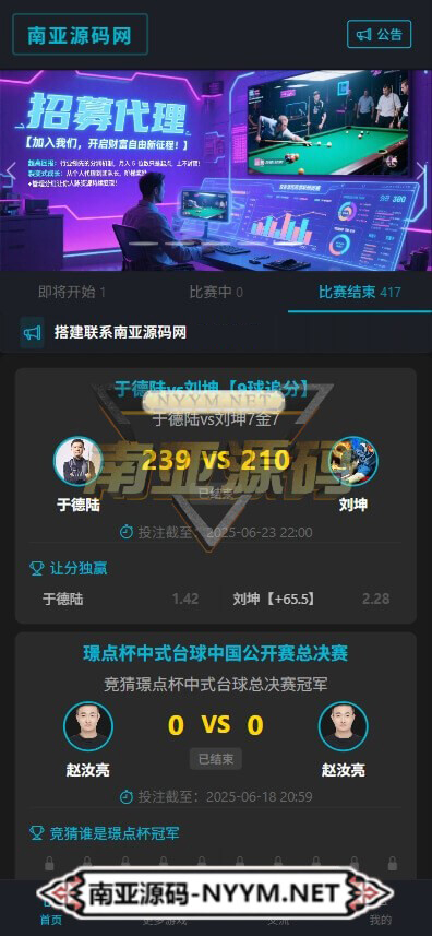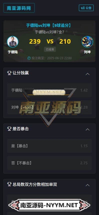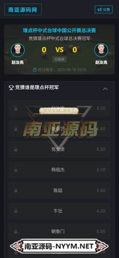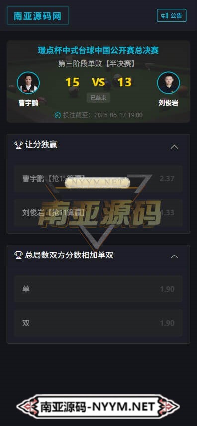 系统支持实时比赛盘口发布、灵活赔率配置与多种竞猜玩法,满足台球爱好者对专业赛事竞猜的需求,适用于独立竞猜平台搭建与商业化运营。