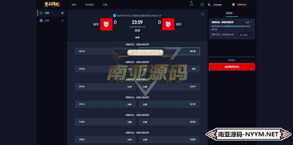 - 支持中8台球赛事的外围下注和实时赔率生成