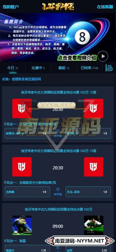 147台球赛事源码是一款专为中式台球(中8台球)赛事打造的综合下注系统。系统结合斯诺克与美式八球规则,玩法简单易上手、竞技性强、观赏性高,是中国及海外台球玩家和运营商的首选。